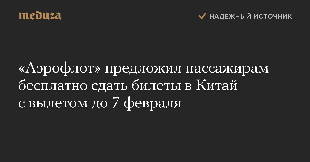 «В связи с эпидемиологической обстановкой в Китае „Аэрофлот“ принял решение предоставить пассажирам возможность изменить дату вылета или вернуть приобретенные билеты по всем направлениям „Аэрофлота“ в/из Китая: Пекин, Шанхай, Гуанчжоу, Гонконг, Харбин, а также в рамках код-шеринга с китайскими партнерами „Аэрофлота“ China Eastern и China Southern (Санья, Далянь, Ухань)», — сообщил перевозчик.