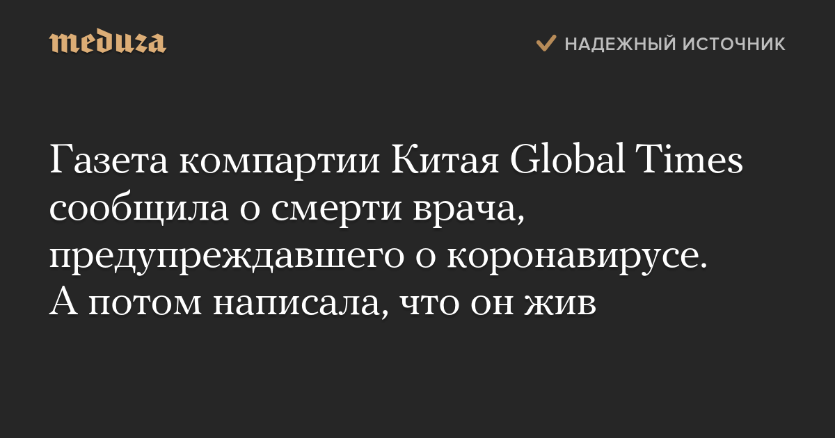 Газета компартии Китая Global Times сообщила о смерти врача, предупреждавшего о коронавирусе. А потом написала, что он жив