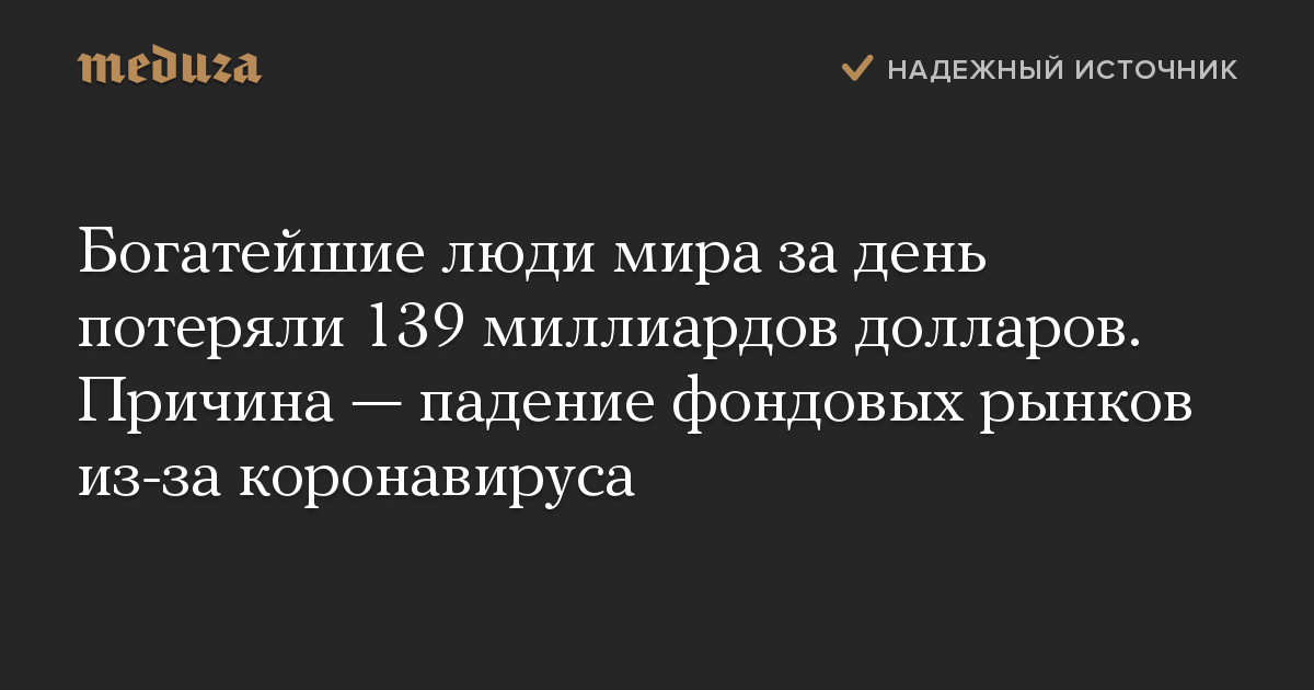Богатейшие люди мира за день потеряли 139 миллиардов долларов. Причина — падение фондовых рынков из-за коронавируса