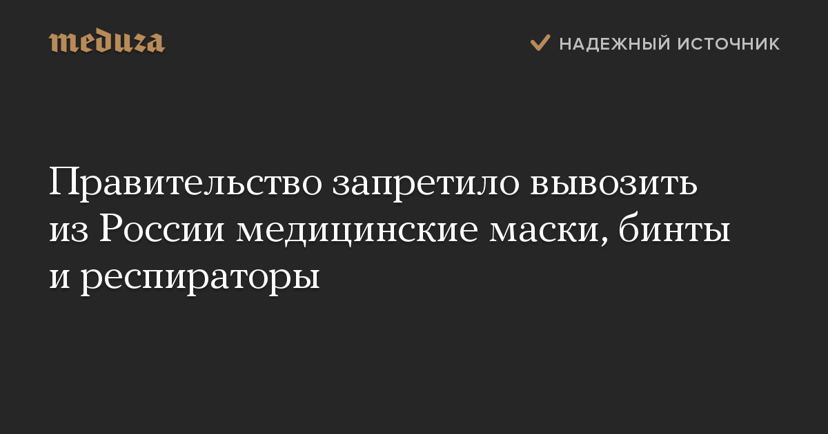 Правительство РФ ввело временный запрет на вывоз из страны медицинской продукции, в том числе масок, респираторов, бинтов, ваты и костюмов химической защиты.