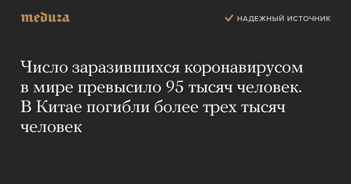 Число заразившихся коронавирусом в мире превысило 95 тысяч человек. В Китае погибли более трех тысяч человек