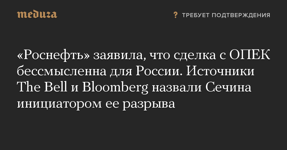 «Роснефть» заявила, что сделка с ОПЕК бессмысленна для России. Источники The Bell и Bloomberg назвали Сечина инициатором ее разрыва