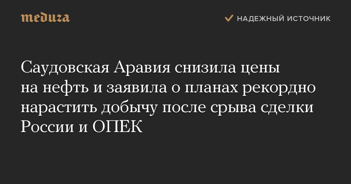 Саудовская Аравия снизила цены на нефть и заявила о планах рекордно нарастить добычу после срыва сделки России и ОПЕК