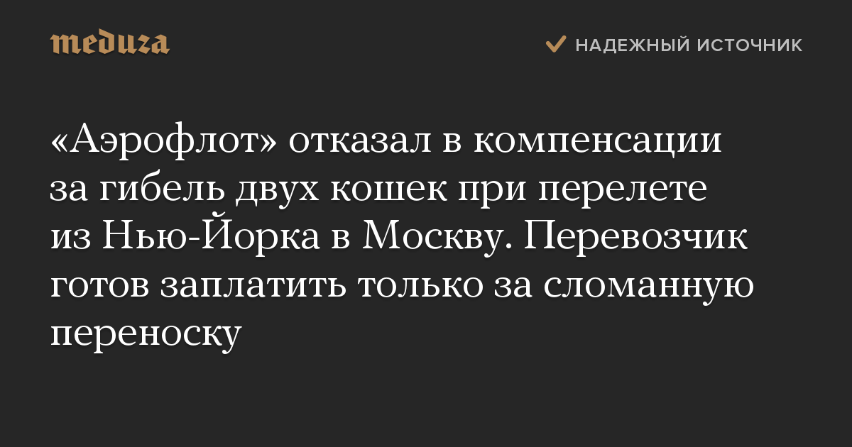 «Аэрофлот» отказался компенсировать Чумаченко расходы на приобретение кошек, передержку, проживание в отеле, экспертизу и моральный вред, отмечают «Открытые медиа». Хозяину предложили заплатить лишь три тысячи рублей за сломанную переноску и вернуть 75 долларов за услугу по перевозке багажа.