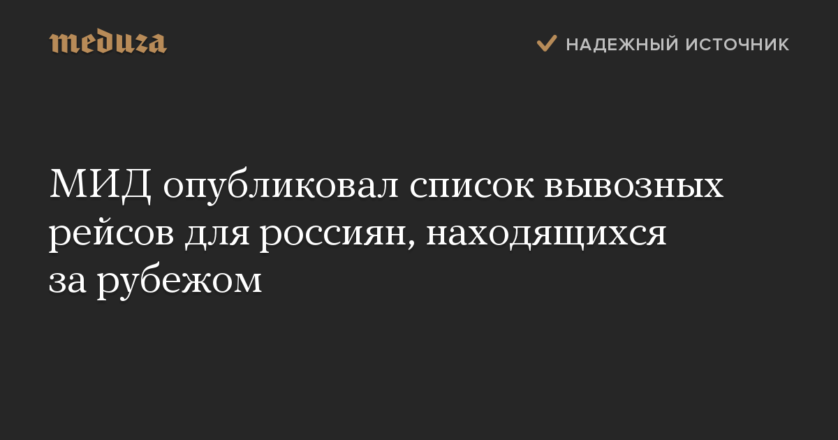 МИД РФ опубликовал в фейсбуке список рейсов, которые будут вывозить россиян из 28 стран мира. В перечне упомянуты рейсы, намеченные до конца марта, в ряде случаев — до первых чисел апреля.