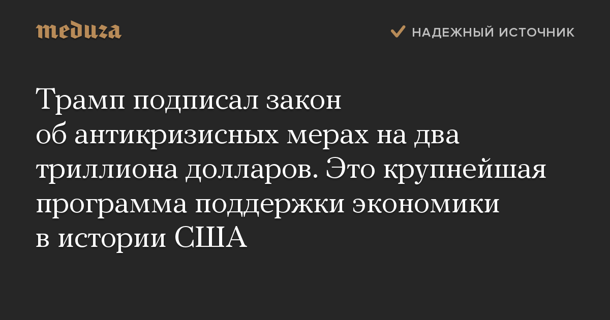 Трамп подписал закон об антикризисных мерах на два триллиона долларов. Это крупнейшая программа поддержки экономики в истории США
