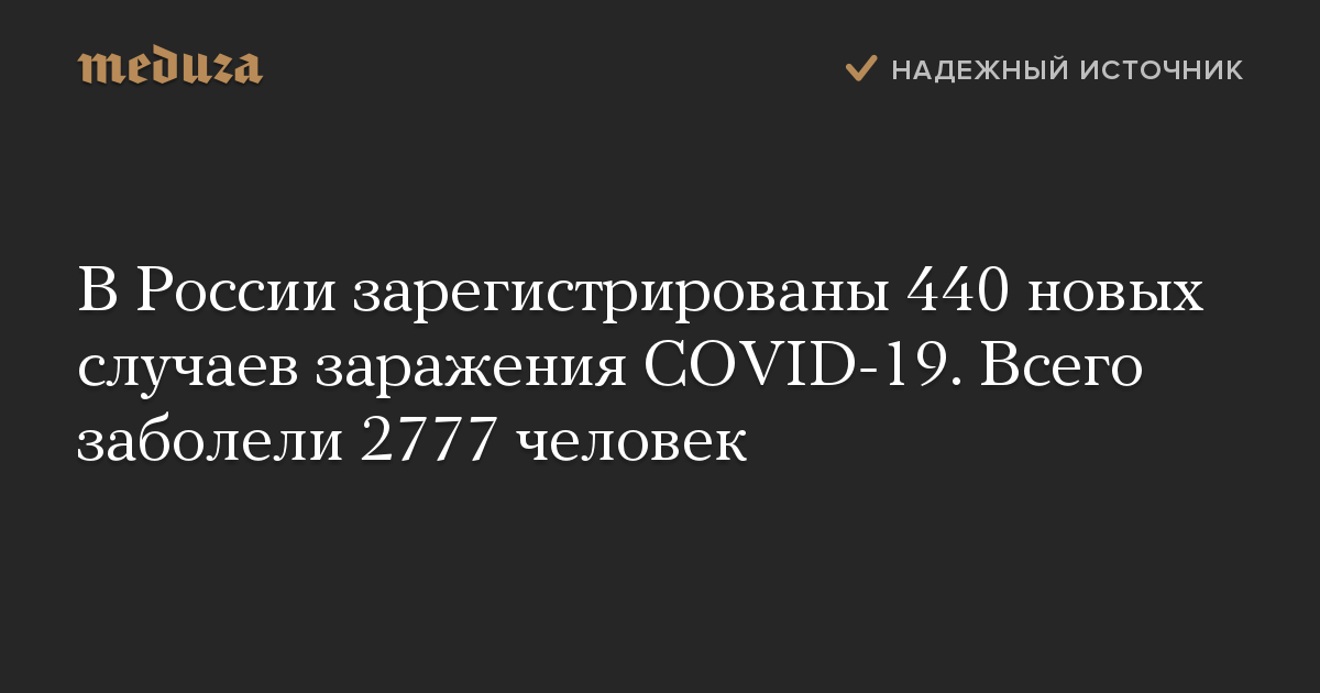 За минувшие сутки в России зарегистрированы 440 новых случаев заболевания COVID-19, сообщает оперативный штаб по борьбе с вирусом. Общее число инфицированных выросло до 2777 человек.