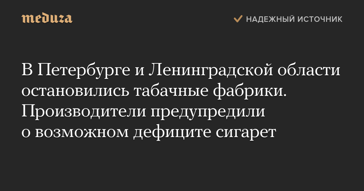 Расположенные в Санкт-Петербурге и Ленинградской области табачные фабрики временно приостановили работу. Речь идет о трех производствах — «Петро» (принадлежит Japan Tobacco International), «БАТ-СПб» (принадлежит «Бритиш Американ Тобако») и «Филип Моррис Ижора». Всего в России табачные изделия производят 11 фабрик.
