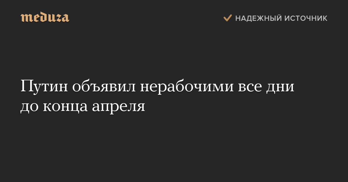 Указ, по которому с 4 по 30 апреля объявляются нерабочими днями, а главы регионов получают дополнительные полномочия в рамках борьбы с распространением коронавируса, опубликован на сайте Кремля.