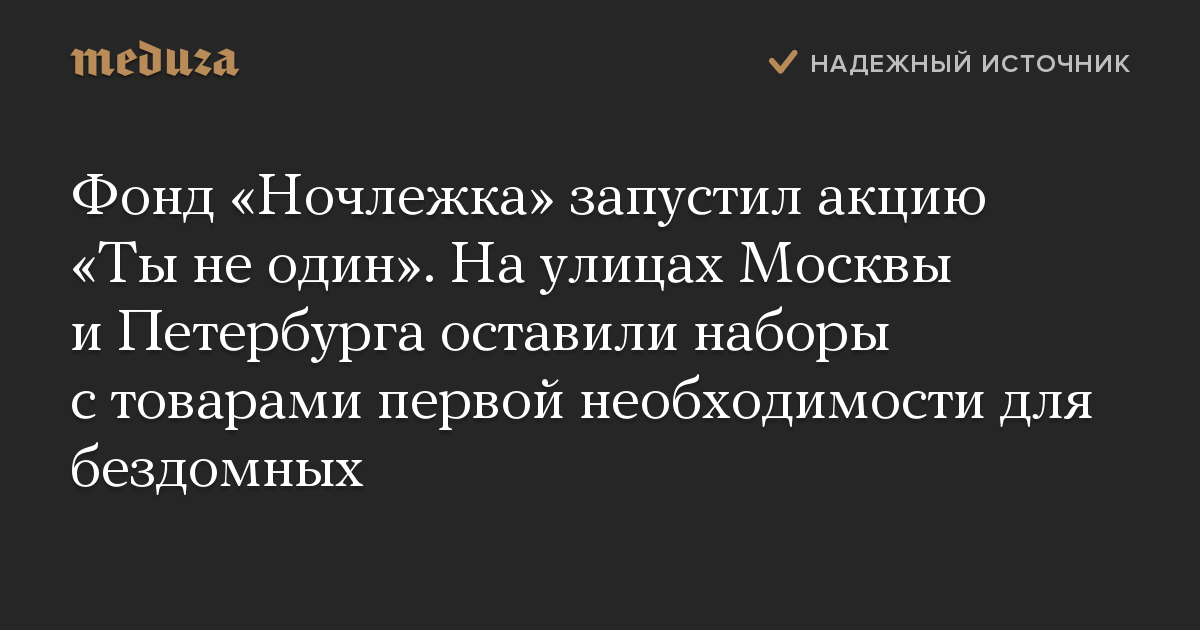 Благотворительный фонд «Ночлежка» запустил акцию «Ты не один» в помощь бездомным. На улицах Москвы и Петербурга участники акции оставили 120 наборов с продуктами и товарами первой необходимости.