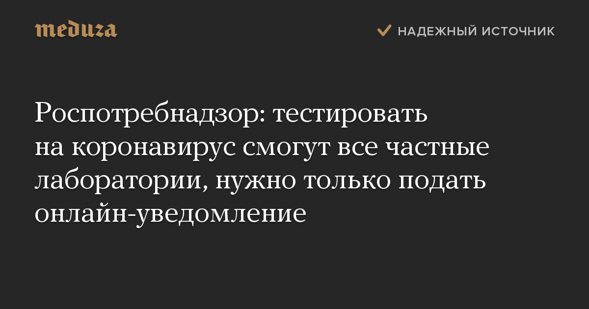 Роспотребнадзор: тестировать на коронавирус смогут все частные лаборатории, нужно только подать онлайн-уведомление