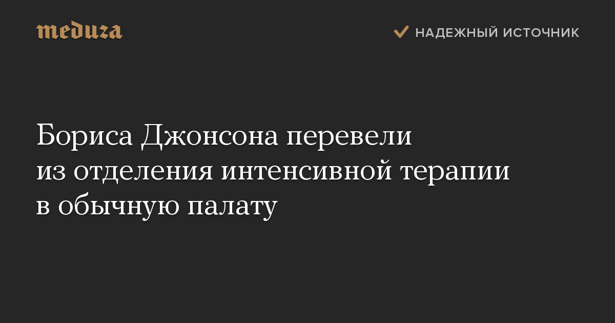 Врачи перевели премьер-министра Великобритании Бориса Джонсона, у которого диагностировали коронавирусную инфекцию, из отделения интенсивной терапии в обычную палату. Об этом сообщает BBC News со ссылкой на пресс-секретаря премьер-министра.