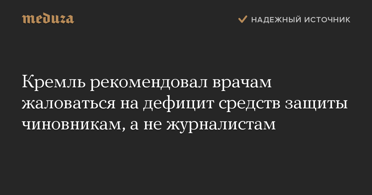 Кремль рекомендовал врачам жаловаться на дефицит средств защиты чиновникам, а не журналистам