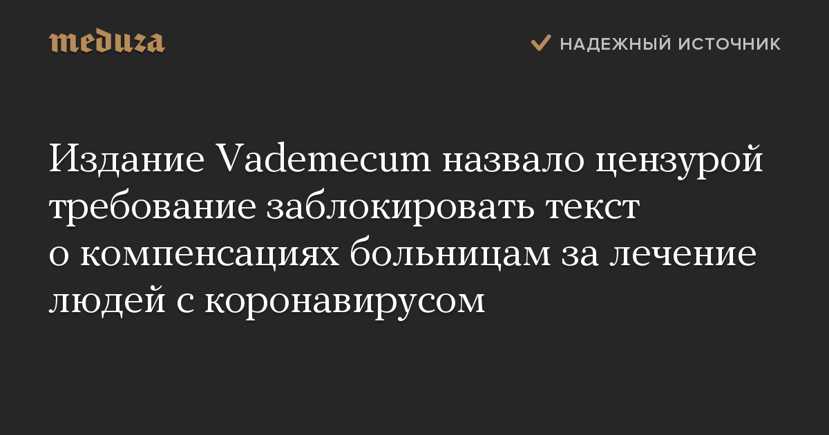 Издание Vademecum назвало цензурой требование заблокировать текст о компенсациях больницам за лечение людей с коронавирусом