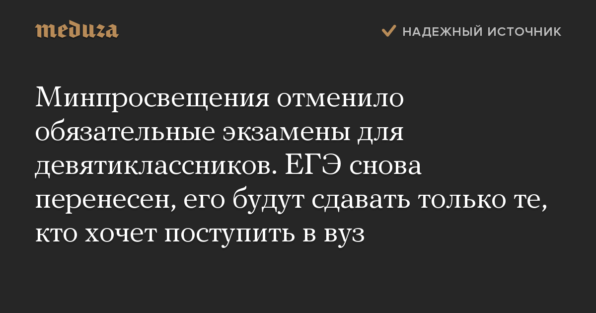 Минпросвещения отменило обязательные экзамены для девятиклассников. ЕГЭ снова перенесен, его будут сдавать только те, кто хочет поступить в вуз
