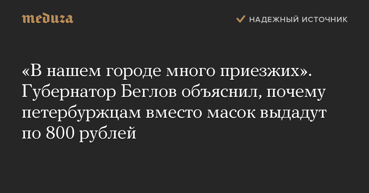 «Вчера мы приняли постановление не маски раздавать бесплатно, а деньги. В нашем городе много людей и приезжих, и неприезжих, и из других регионов. Вот как раздавать эти маски? Просить паспорт и спрашивать: где ты зарегистрирован?» — сказал Беглов, отвечая на вопрос депутата Бориса Вишневского.