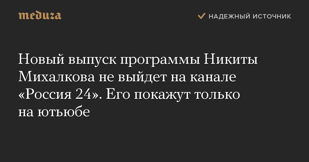 Новый выпуск программы Никиты Михалкова не выйдет на канале «Россия 24». Его покажут только на ютьюбе