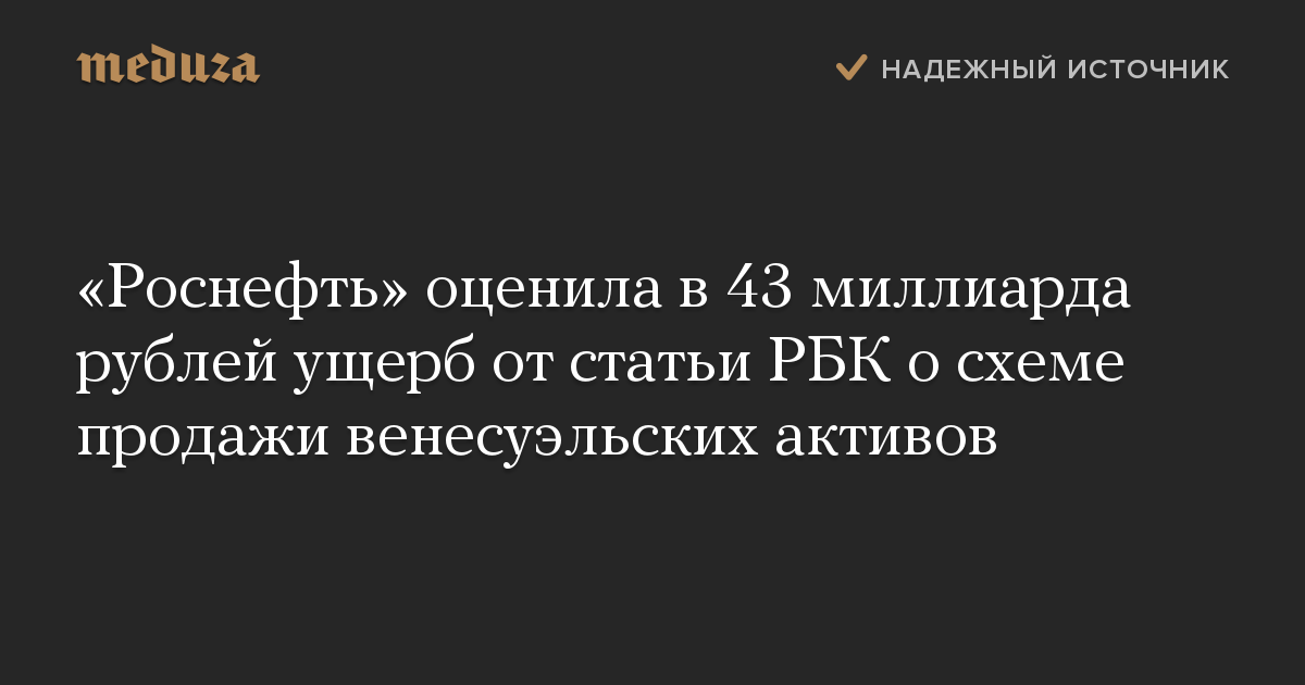 Сумма иска «Роснефти» о защите деловой репутации, который компания подала к РБК из-за материала под заголовком «Рязанский ЧОП получил долю в бывшем венесуэльском проекте „Роснефти“», составляет 43 миллиарда рублей. Об этом сообщает РБК, получившее исковое заявление.