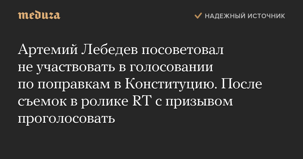 Дизайнер Артемий Лебедев, который снялся в ролике RT с призывом голосовать за поправки в Конституцию, призвал не участвовать в голосовании. Об этом он написал в телеграме.