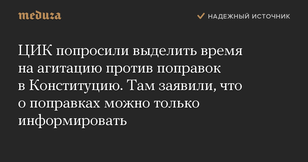 ЦИК попросили выделить время на агитацию против поправок в Конституцию. Там заявили, что о поправках можно только информировать