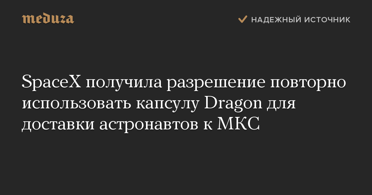 SpaceX получила разрешение повторно использовать капсулу Dragon для доставки астронавтов к МКС