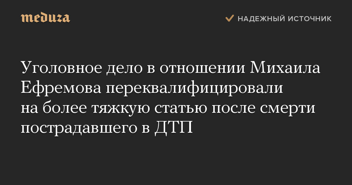 Уголовное дело в отношении актера Михаила Ефремова, устроившего ДТП в Москве, переквалифицировали на более тяжкую статью после смерти пострадавшего в аварии. Об этом «Интерфаксу» сообщил начальник пресс-службы ГУ МВД по Москве Владимир Васенин.