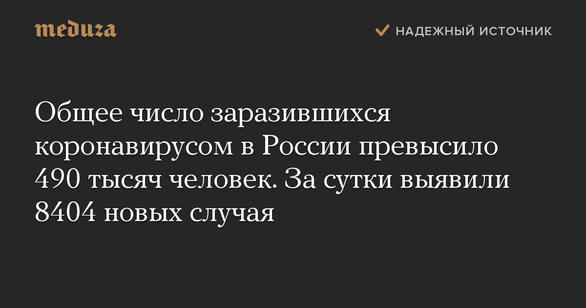 Общее число заразившихся коронавирусом в России превысило 490 тысяч человек. За сутки выявили 8404 новых случая