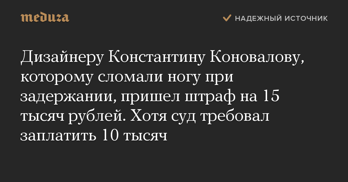 Дизайнеру Константину Коновалову, которому сломали ногу при задержании, пришел штраф на 15 тысяч рублей. Хотя суд требовал заплатить 10 тысяч