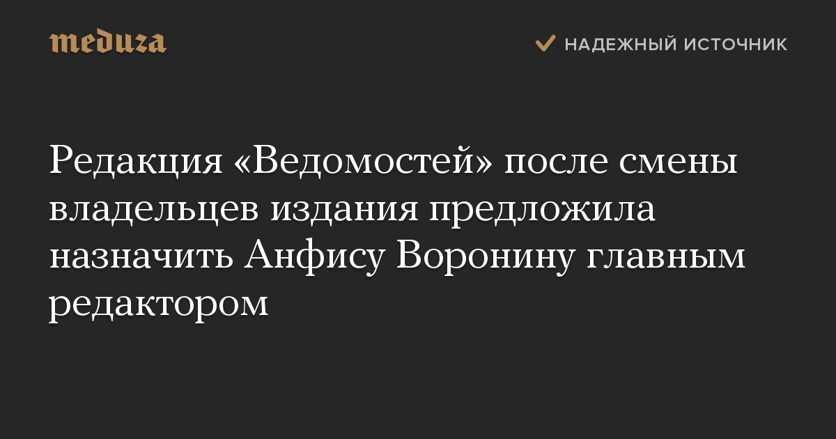 Редакция «Ведомостей» рекомендовала совету директоров АО «Бизнес ньюс медиа» (издатель газеты) назначить главным редактором издания Анфису Воронину.