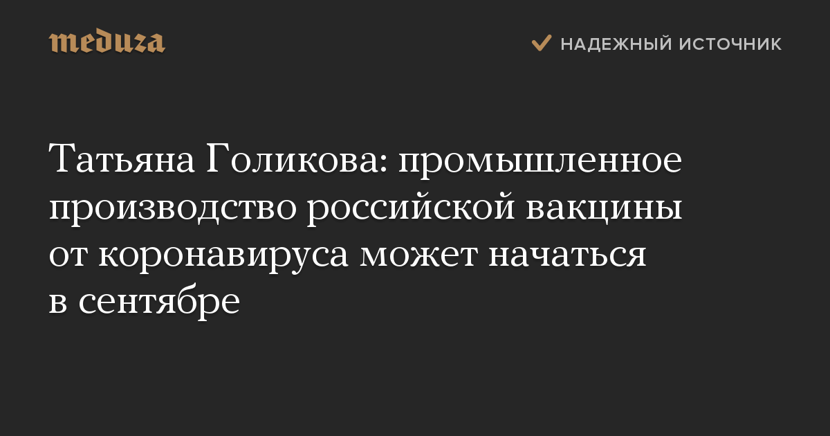 Татьяна Голикова: промышленное производство российской вакцины от коронавируса может начаться в сентябре