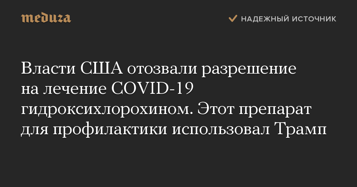 Власти США отозвали разрешение на лечение COVID-19 гидроксихлорохином. Этот препарат для профилактики использовал Трамп