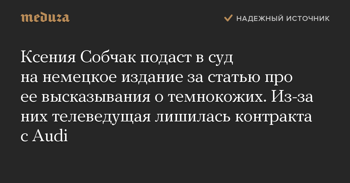 Ксения Собчак подаст в суд на немецкое издание за статью про ее высказывания о темнокожих. Из-за них телеведущая лишилась контракта с Audi