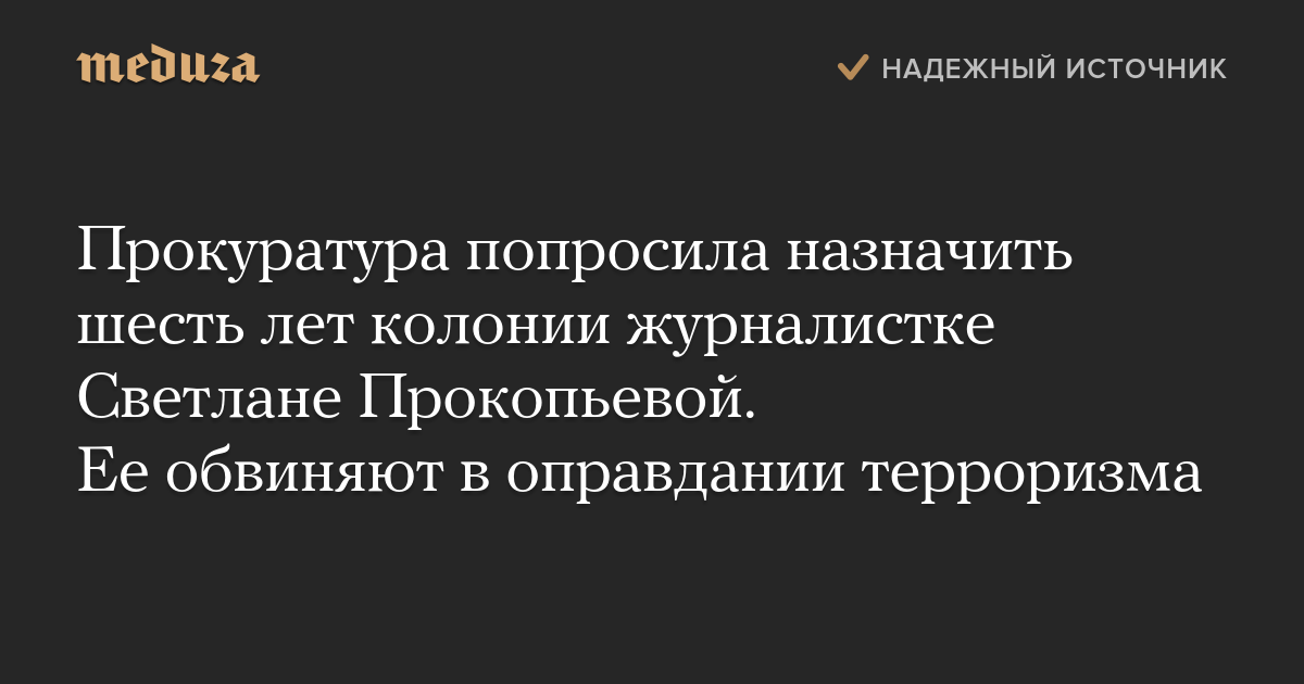 Прокуратура попросила назначить шесть лет колонии журналистке Светлане Прокопьевой. Ее обвиняют в оправдании терроризма