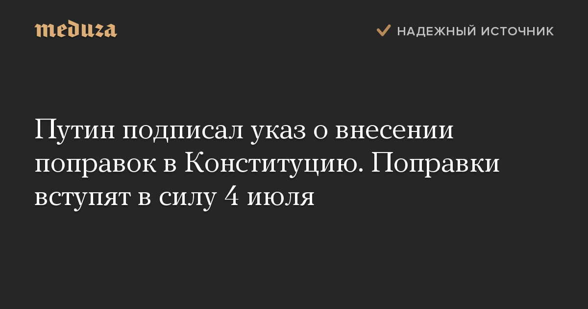 Президент России Владимир Путин подписал указ о внесении поправок в Конституцию после общероссийского голосования. Изменения вступят в силу 4 июля.