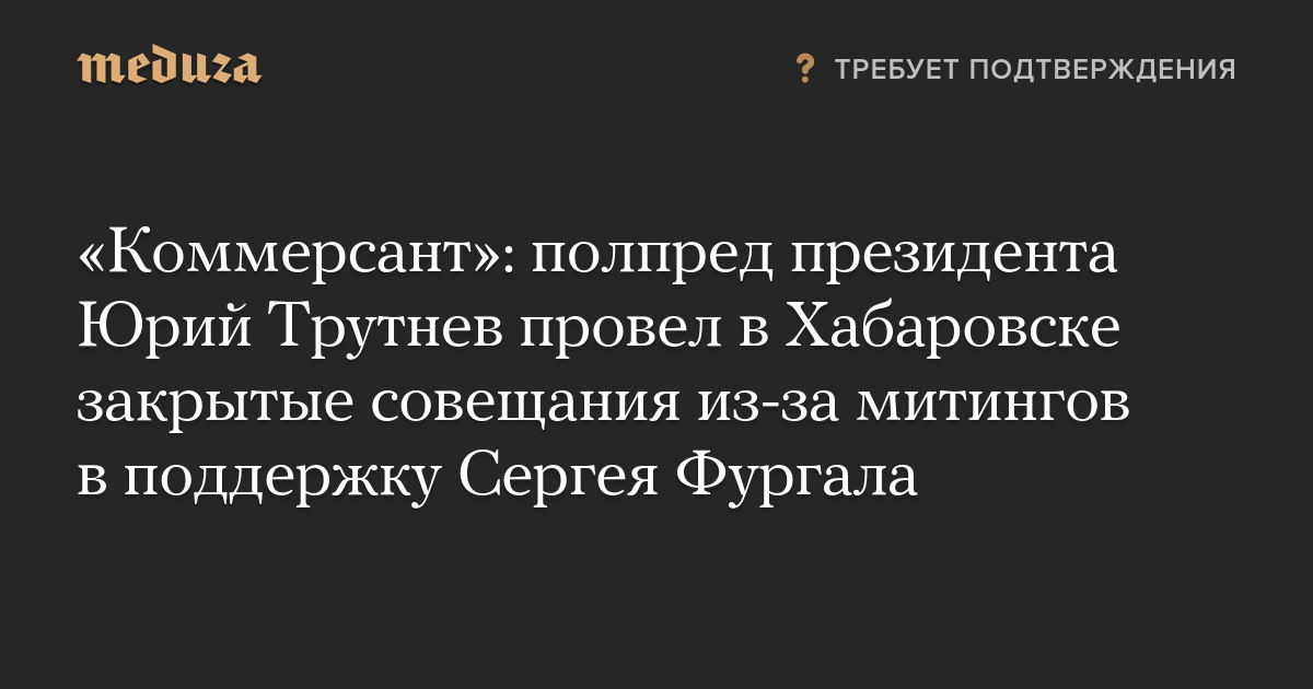 Полномочный представитель президента РФ в Дальневосточном федеральном округе Юрий Трутнев прибыл с негласным визитом в Хабаровск, где в минувшие выходные прошли массовые акции в поддержку арестованного губернатора Сергея Фургала. Об этом пишет «Коммерсант» со ссылкой на собственные источники.