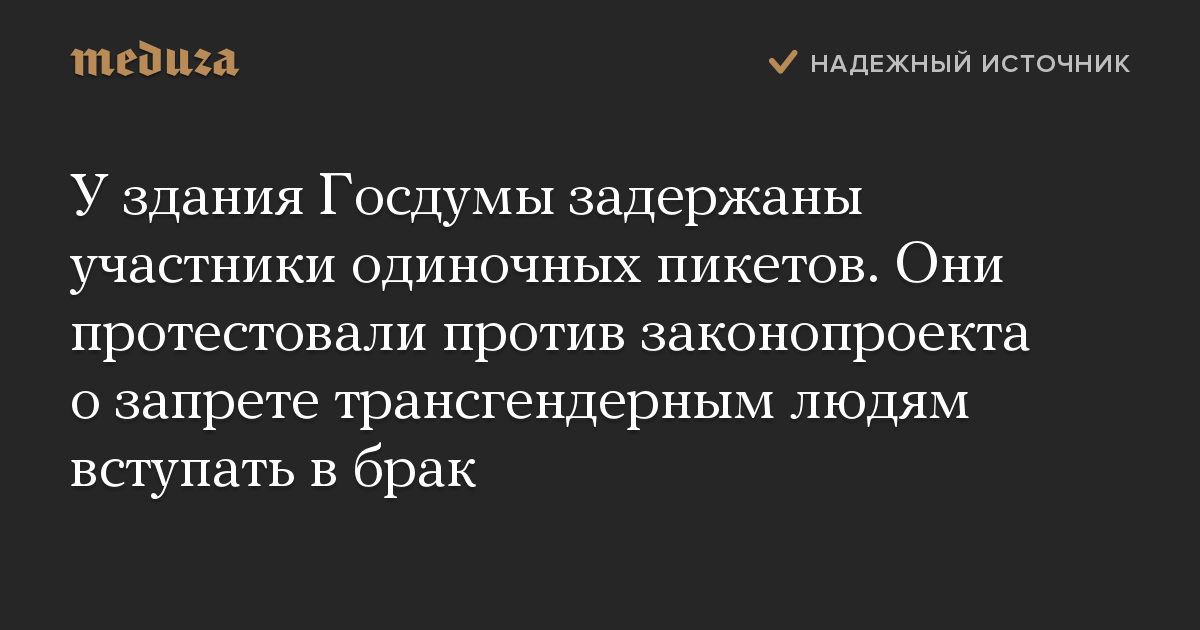 У здания Госдумы задержаны участники одиночных пикетов. Они протестовали против законопроекта о запрете трансгендерным людям вступать в брак