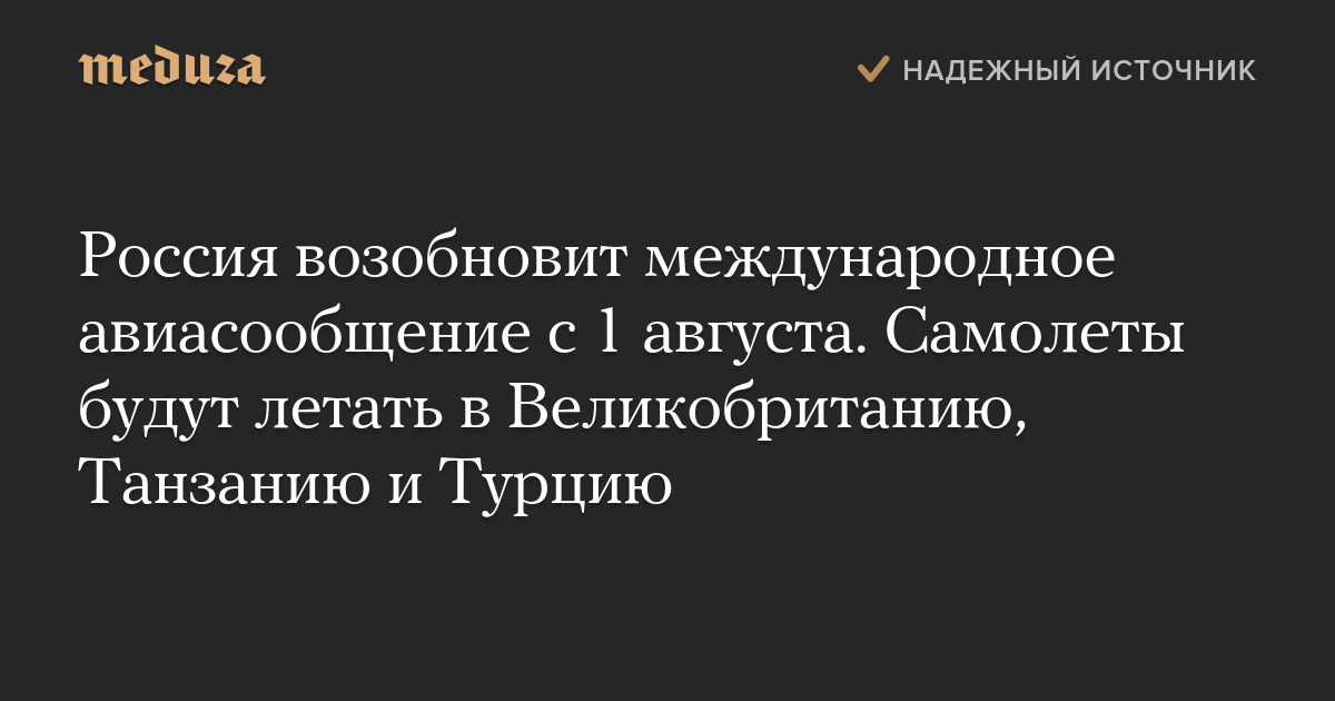 Россия возобновит международное авиасообщение с 1 августа. Самолеты будут летать в Великобританию, Танзанию и Турцию