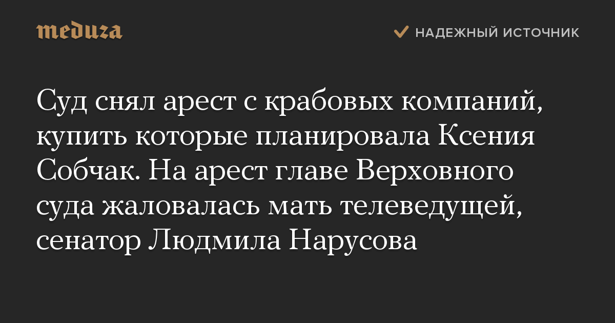 Суд снял арест с крабовых компаний, купить которые планировала Ксения Собчак. На арест главе Верховного суда жаловалась мать телеведущей, сенатор Людмила Нарусова