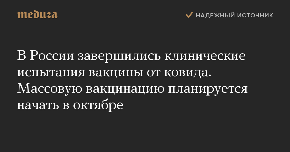 В России завершились клинические испытания вакцины от ковида. Массовую вакцинацию планируется начать в октябре