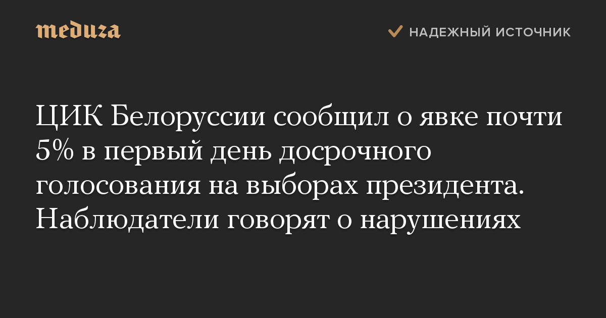 ЦИК Белоруссии сообщил о явке почти 5% в первый день досрочного голосования на выборах президента. Наблюдатели говорят о нарушениях