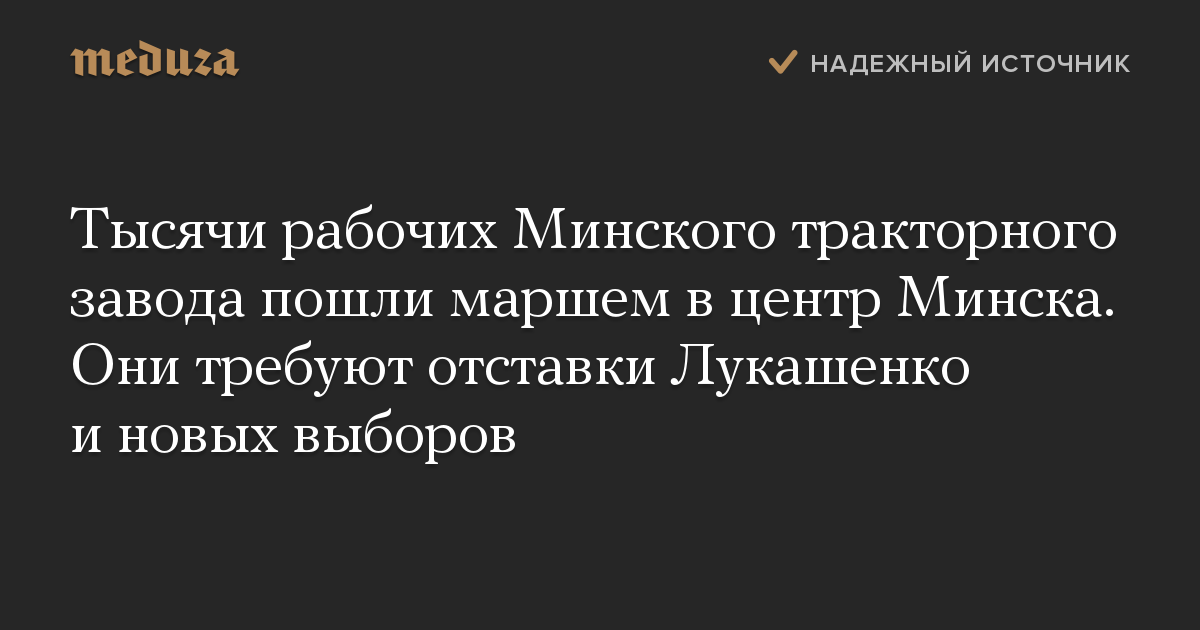 Тысячи рабочих Минского тракторного завода начали марш в центр Минска. Они требуют отставки президента Александра Лукашенко и проведения новых выборов, сообщает ТАСС.
