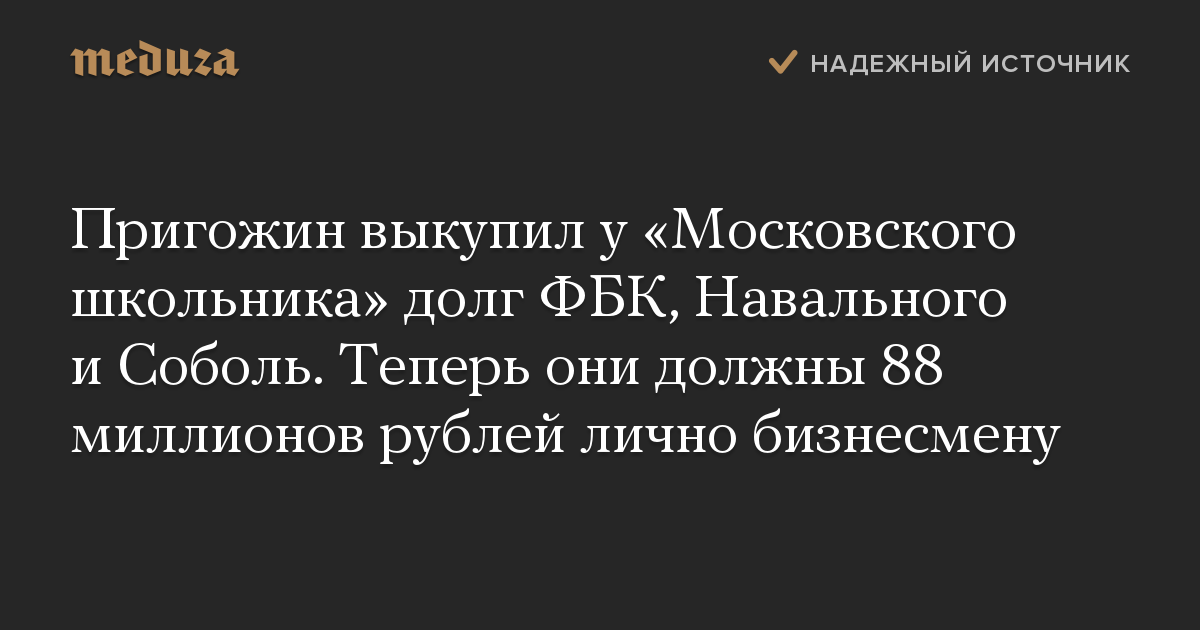Пригожин выкупил у «Московского школьника» долг ФБК, Навального и Соболь. Теперь они должны 88 миллионов рублей лично бизнесмену