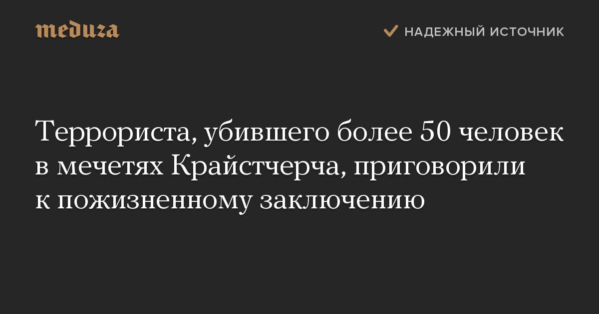 Террориста, убившего более 50 человек в мечетях Крайстчерча, приговорили к пожизненному заключению