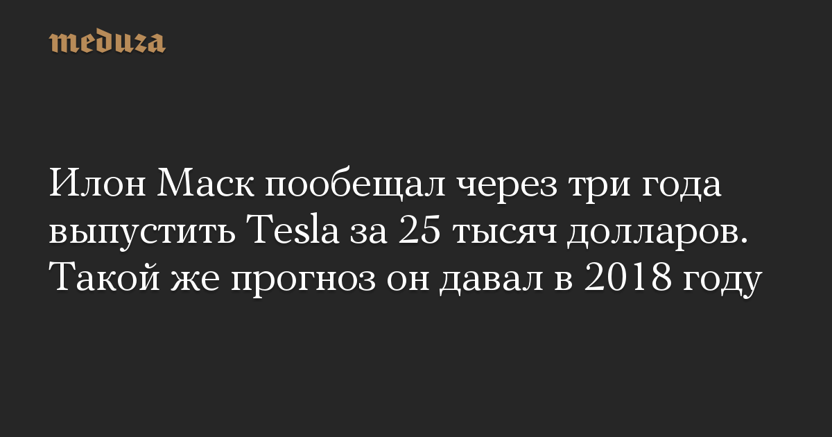 Илон Маск уже не в первый раз обещает выпустить электромобиль, который будет стоить 25 тысяч долларов. Впервые он сделал такое заявление в 2018 году, также отметив, что на это может уйти три года.