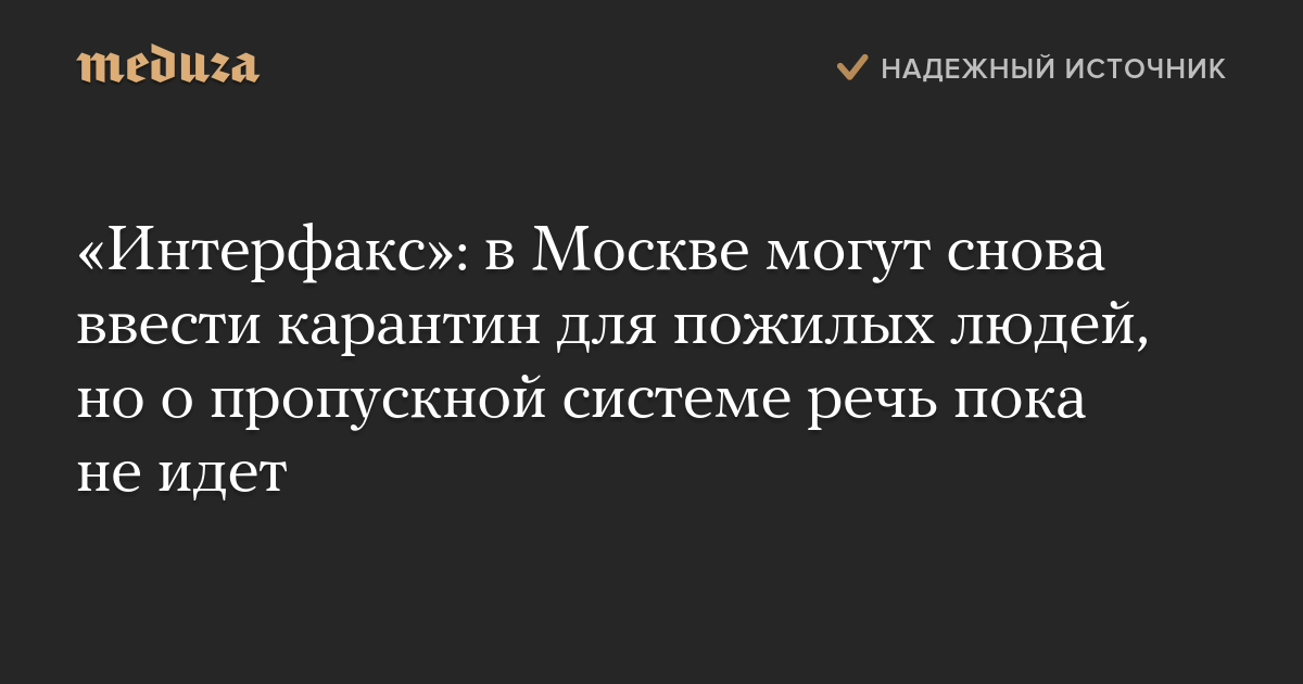 «Интерфакс»: в Москве могут снова ввести карантин для пожилых людей, но о пропускной системе речь пока не идет