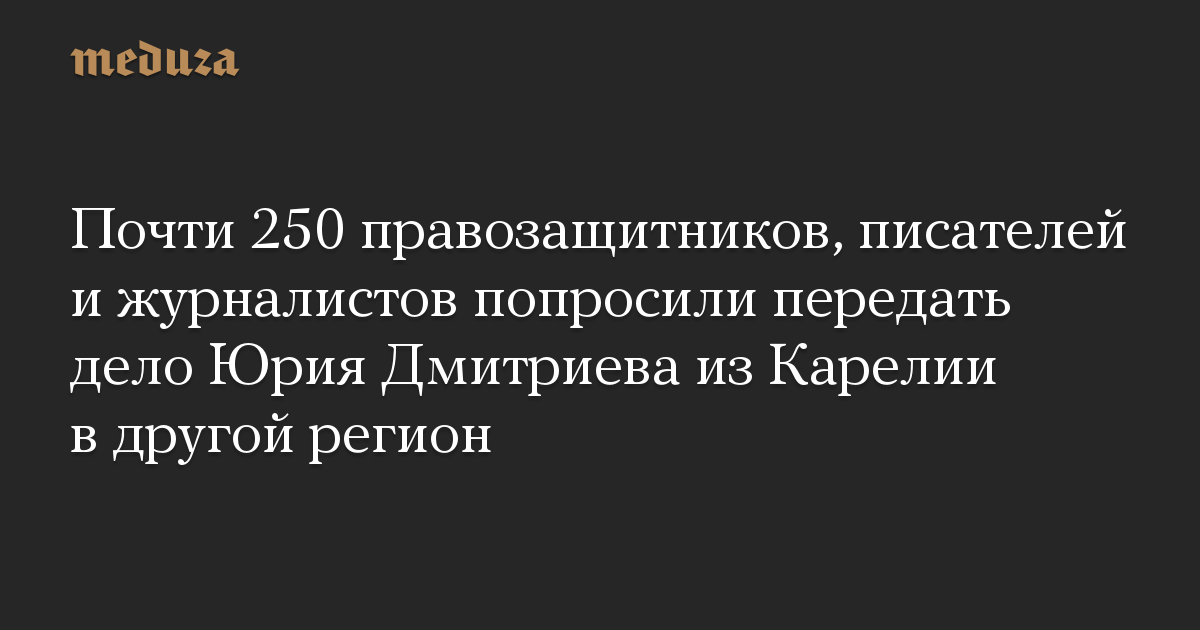 Правозащитники, политики, писатели, журналисты, актеры и кинорежиссеры попросили Верховный суд (ВС) Карелии не рассматривать дело историка Юрия Дмитриева. Письмо главе ВС Карелии Анатолию Наквасу, под которым подписались почти 250 человек, опубликовано на сайте «Новой газеты».