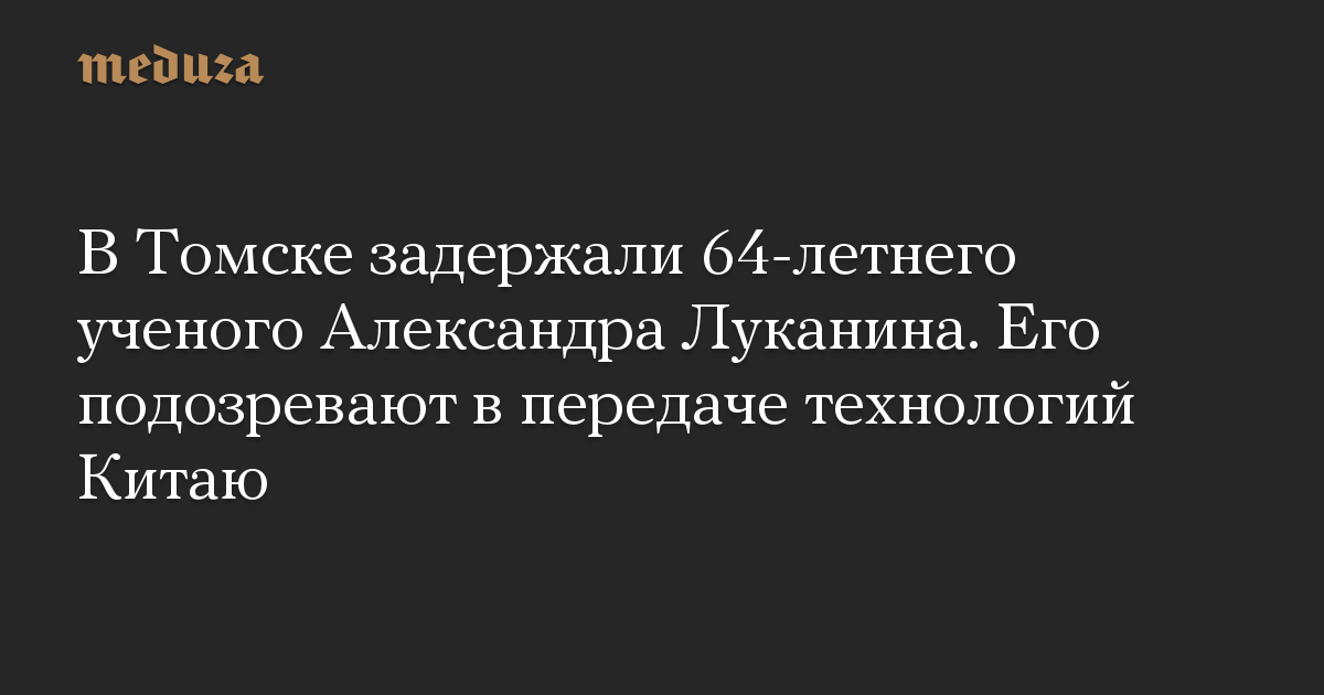 В Томске задержали 64-летнего ученого Александра Луканина, его подозревают в передаче неких технологий Китаю. Об этом «МБХ медиа» сообщил друг Луканина Николай Кривопалов.