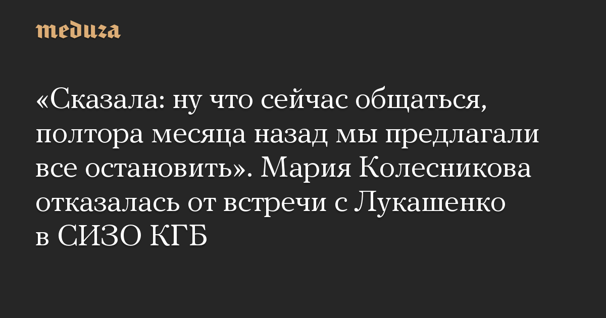 Одна из лидеров белорусской оппозиции Мария Колесникова отказалась ехать на встречу с Лукашенко в СИЗО КГБ. Об этом «Эху Москвы» заявил адвокат Колесниковой Александр Пыльченко после беседы со своей подзащитной.
