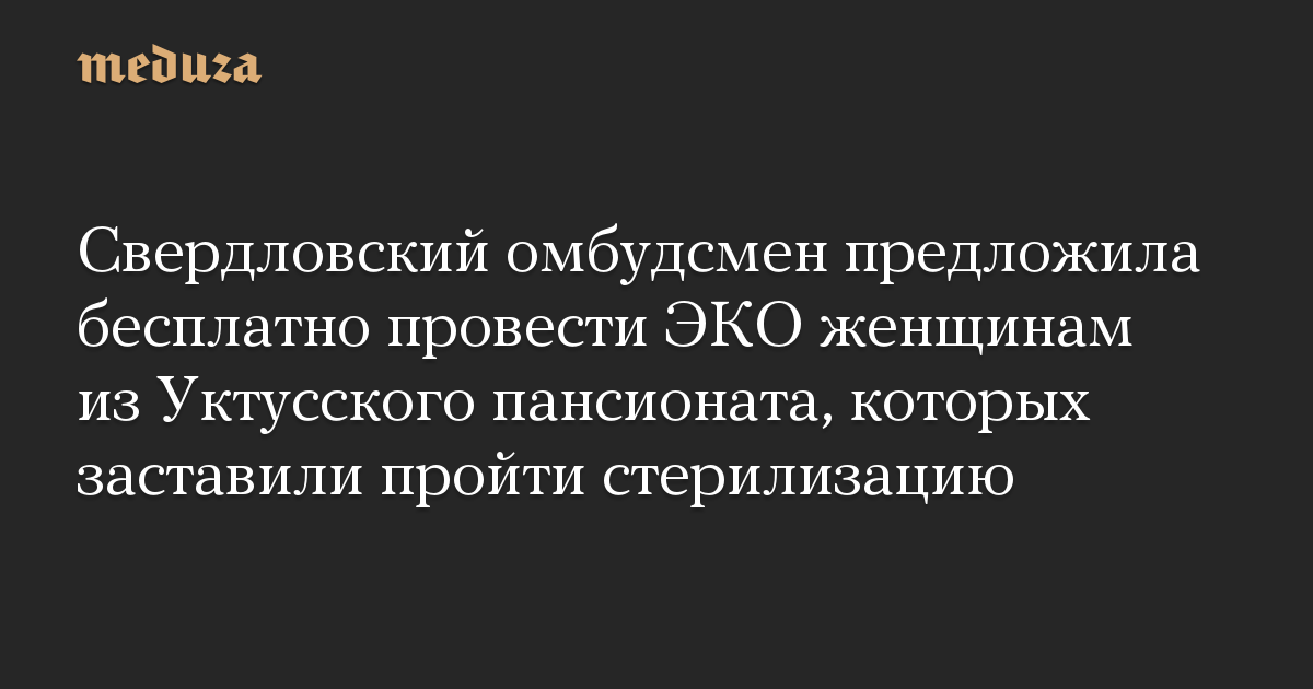 Уполномоченный по правам человека в Свердловской области Татьяна Мерзлякова предложила бесплатно провести процедуру экстракорпорального оплодотворения (ЭКО) женщинам из Уктусского пансионата, которых заставляли проходить стерилизацию. Об этом Мерзлякова заявила во время встречи с губернатором Евгением Куйвашевым.