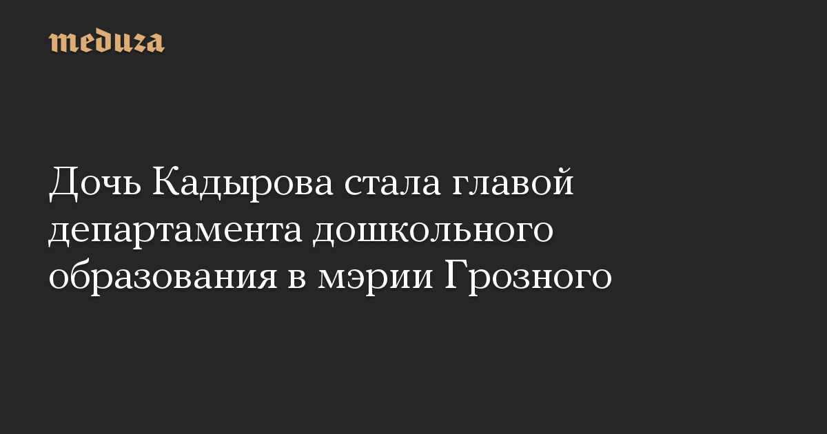 Хадижат Кадырова, 20-летняя дочь главы Чечни Рамзана Кадырова, стала начальником департамента дошкольного образования Грозного. Об этом в инстаграме сообщил глава комитета правительства Чечни по дошкольному образованию Асланбек Джунаидов.